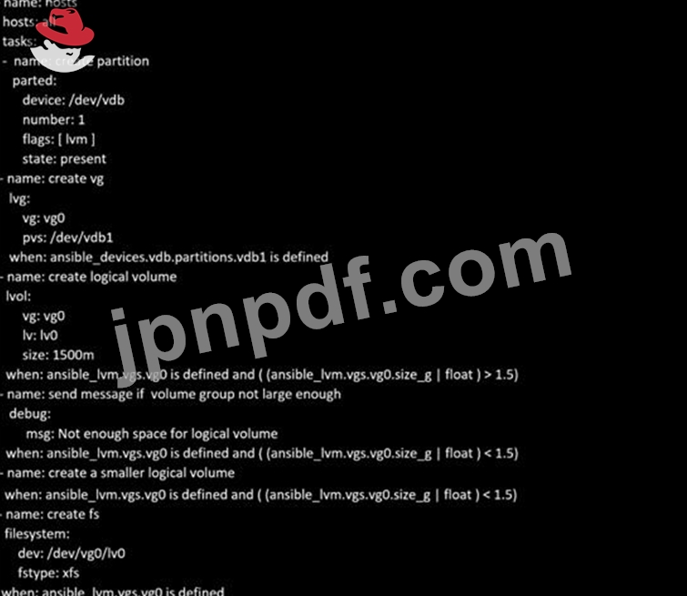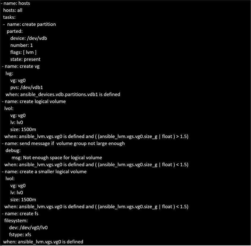 /home/sandy/ansible/ に logvol.yml という Playbook を作成します。劇中では、Iv0 という名前の論理ボリュームを作成し、ボリューム グループ vgO 上でサイズ 1500MiB にします。ボリューム グループに十分なスペースがない場合は、「論理ボリュームに十分なスペースがありません」というメッセージを表示し、代わりに 800MiB Iv0 を作成します。ボリューム グループがまだ存在しない場合は、「ボリューム グループが存在しません」というメッセージを作成します。すべての Iv0 論理ボリュームに xfs ファイルシステムを作成します。論理ボリュームをマウントしないでください。
