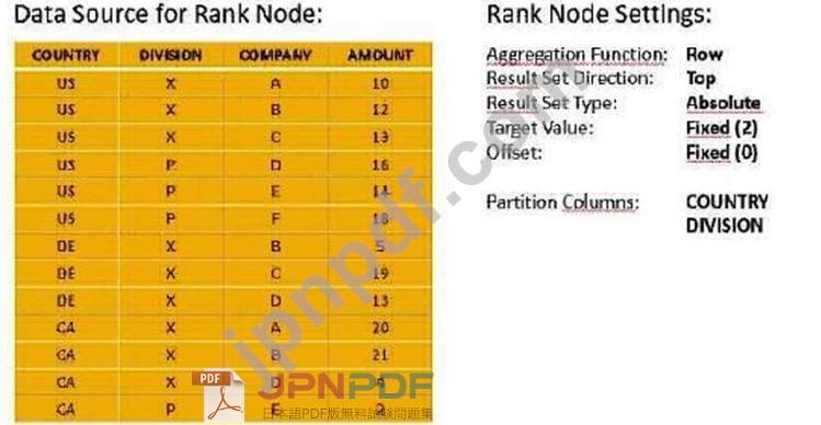 A calculation view includes a rank node that uses the source data and settings shown in the graphic. Your query requests all columns of the rank node. How many rows are in the output of your query?