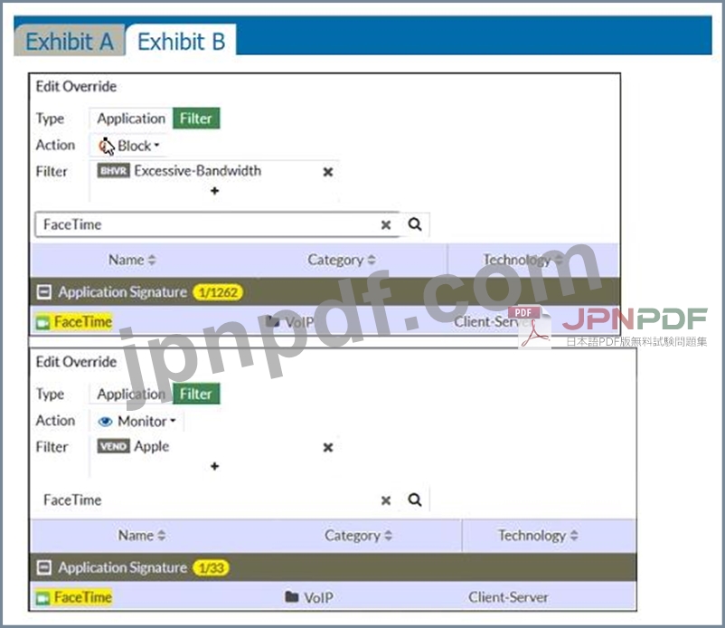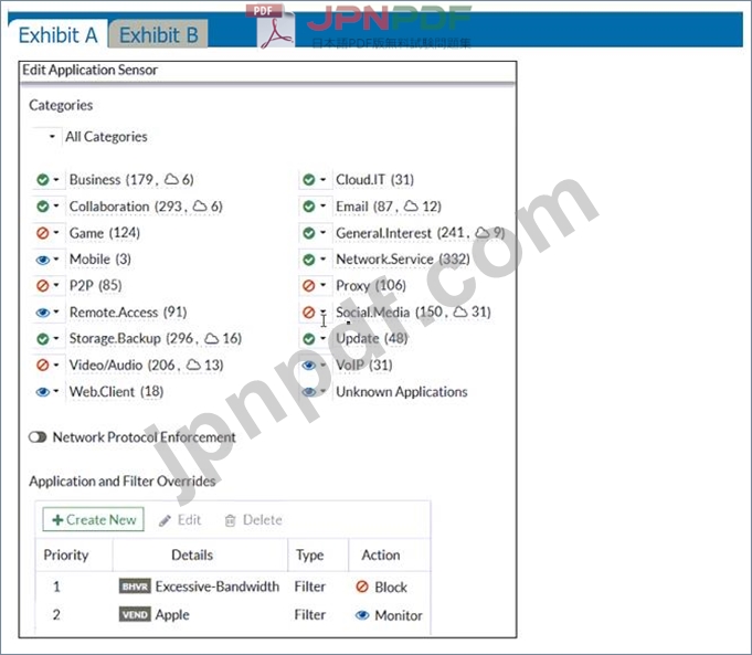 Exhibit A shows the application sensor configuration. Exhibit B shows the Excessive-Bandwidth and Apple filter details.