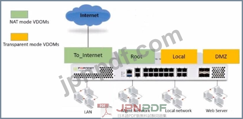 The Root and To_Internet VDOMs are configured in NAT mode. The DMZ and Local VDOMs are configured in transparent mode.