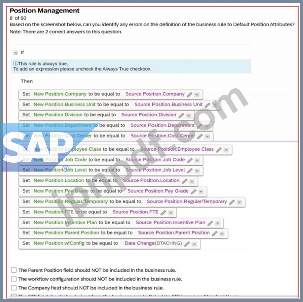 以下のスクリーンショットに基づいて、デフォルトのポジション属性に対するビジネス ルールの定義にエラーがないか確認できますか? 注: この質問には 2 つの正解があります。