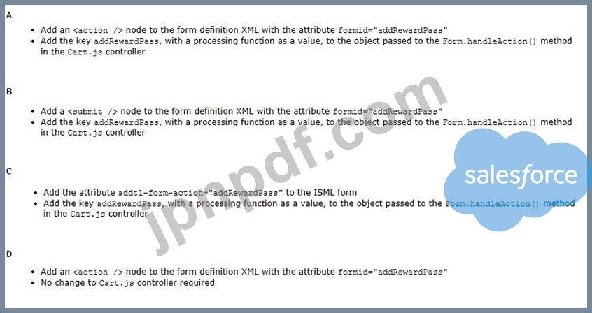 デジタル開発者は、顧客がリワードパスIDを入力できるように、ショッピングカートページに新しいフォームを追加する必要があります。他のカートフォームの処理を処理する既存のCart.jsコントローラーがすでに存在します。さらに、フォームフィールドノードはフォームXMLであり、必要なフォーム入力はISMLテンプレートにあります。