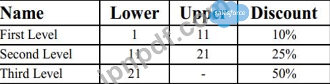 Universal Containers には、製品 A に対して次の割引レベルのスラブ割引スケジュールがあります。