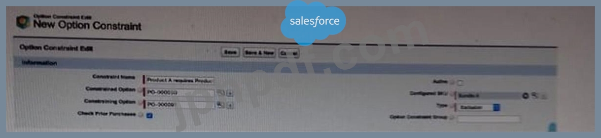 管理者が複数のオプション制約を設定しています。バンドルを設定する際、ユーザーが製品Aを選択しない限り、製品Bを選択できないようにする必要があります。