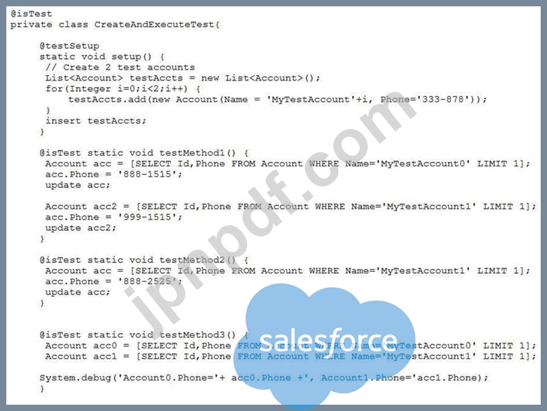 以下のコードで testSetup を使用してテスト データを作成すると、testMethod3 のデバッグ ステートメントの結果はどうなりますか?