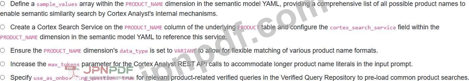 A Gen AI Specialist is tasked with enhancing a Cortex Analyst semantic model to improve the accuracy of literal string searches for product names within user queries. The product names are stored in a high-cardinality PRODUCT_NAME column in the underlying PRODUCT table. The current semantic model already defines a dimension for PRODUCT_NAME. Which of the following configurations and considerations are essential for integrating Cortex Search with Cortex Analyst to achieve this goal?