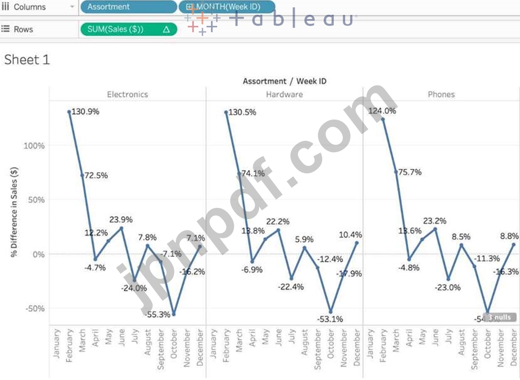 時系列テーブルを使用して、品揃えごとに分類された、売上の月ごとの前年比成長を示す折れ線グラフを作成します。エレクトロニクスの品揃えについて、前年比で最もマイナスの値を示したのはどの月ですか?