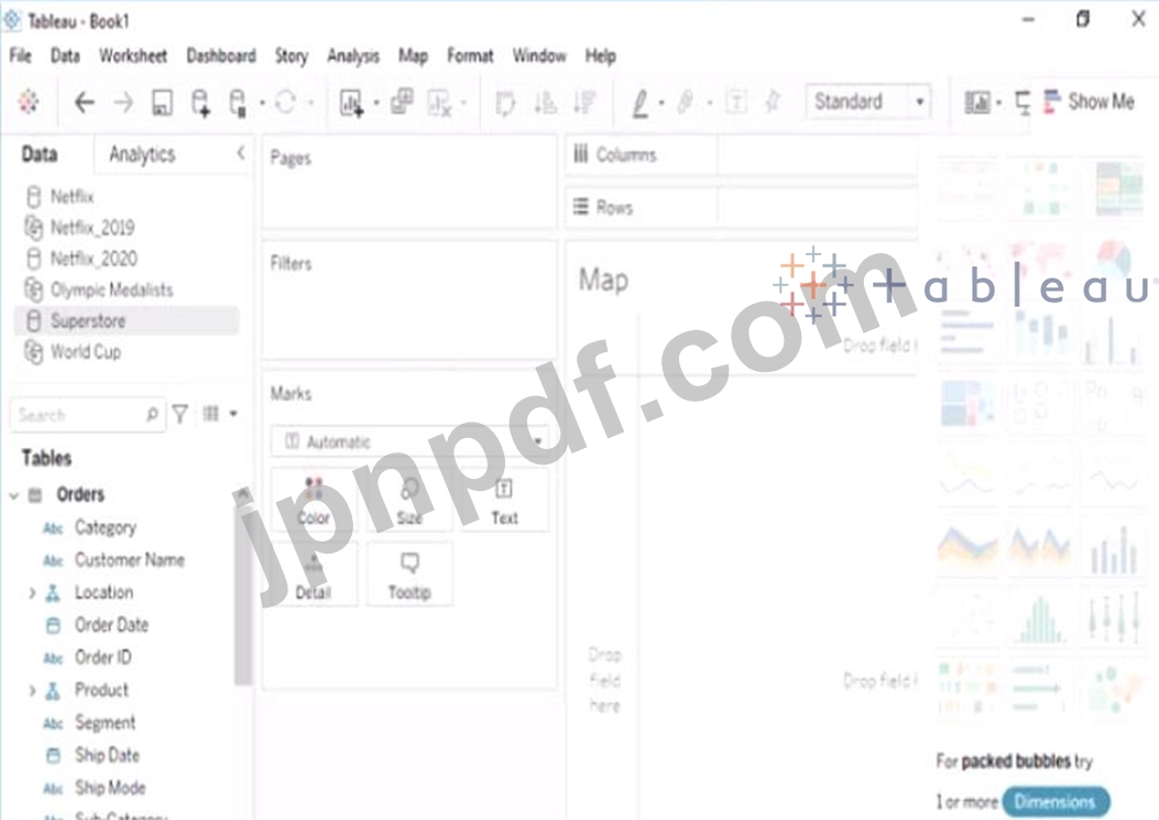 デスクトップにある Book1 へのリンクを開きます。Map ワークシートを開き、Superstore データ ソースを使用します。