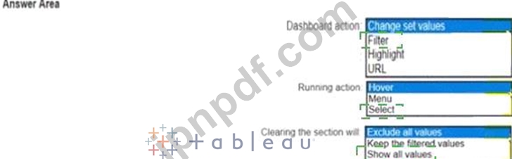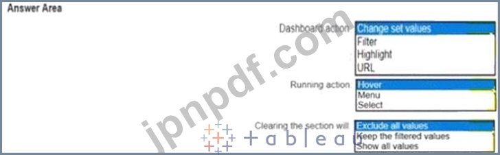 棒グラフのデータは、ユーザーが別の都市を選択した場合にのみ変更される必要があります。ダッシュボードのアクションをどのように構成すればよいですか? (回答領域のドロップダウンを使用して、正しいオプションを選択してください。)