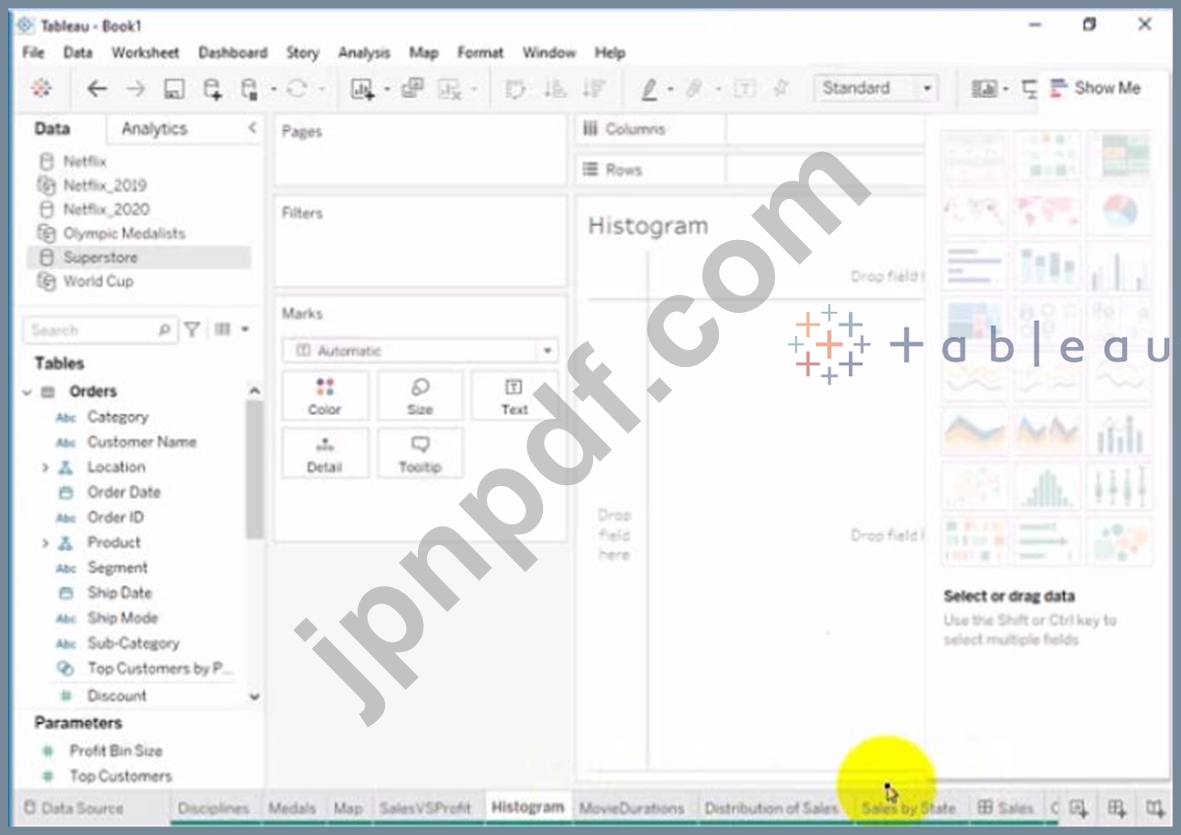 デスクトップにあるBook1へのリンクを開きます。ヒストグラムワークシートを開き、Superstoneデータソースを使用します。