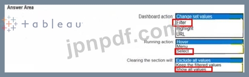 ユーザーが地図上で都市を選択した場合、棒グラフには選択した都市のデータのみが表示される必要があります。棒グラフのデータは、ユーザーが別の都市を選択した場合にのみ変更される必要があります。ダッシュボードアクションはどのように設定すればよいですか?(回答エリアのドロップダウンを使用して適切なオプションを選択してください。)