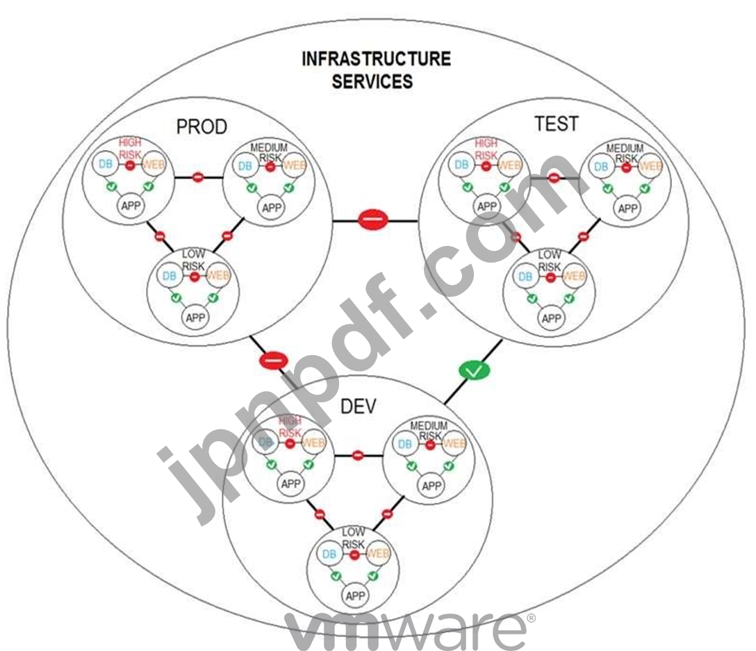 ある金融会社は、ネットワーク セキュリティを簡素化する目的でマイクロ サービスを採用しています。NSX-T アーキテクトは、NSX-T Data Center のマイクロセグメンテーション論理設計を提案しています。アーキテクトは、顧客と共有する図を作成しました。